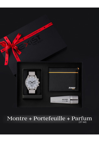 399,00 MADCe coffret réunit trois articles : le parfum RECORD 27 ml, une montre en acier robuste au design intemporel, ainsi qu’un portefeuille noir signé EXIST, rehaussé d’un détail jaune distinctif. Un ensemble raffiné qui allie caractère, style et praticité, idéal pour offrir ou se faire plaisir.
