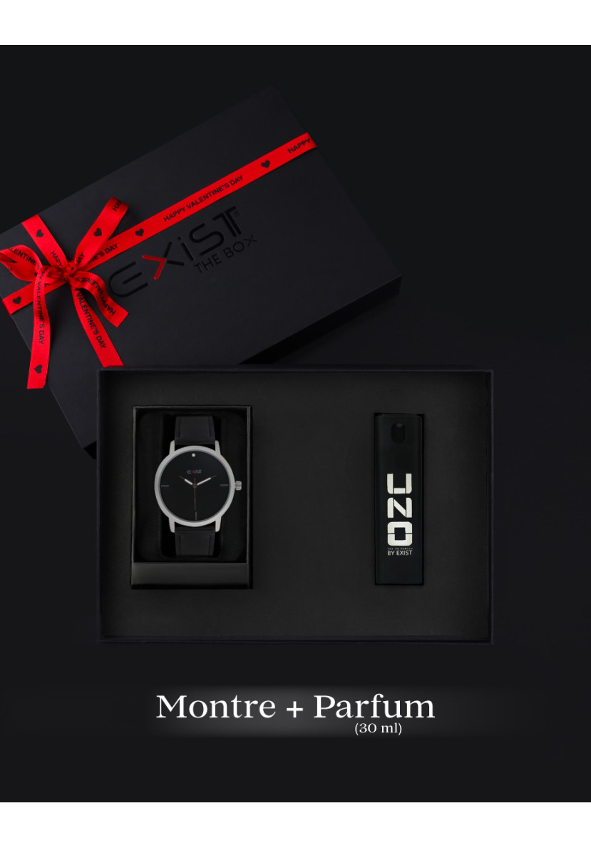 Ce coffret associe une élégante montre noire au cadran assorti et boîtier argenté, ornée d’index minimalistes, avec le parfum UNO 30 ml. Sa fragrance boisée et aromatique incarne une modernité masculine, alliant style raffiné et caractère affirmé pour un duo parfait entre accessoire intemporel et signature olfactive.