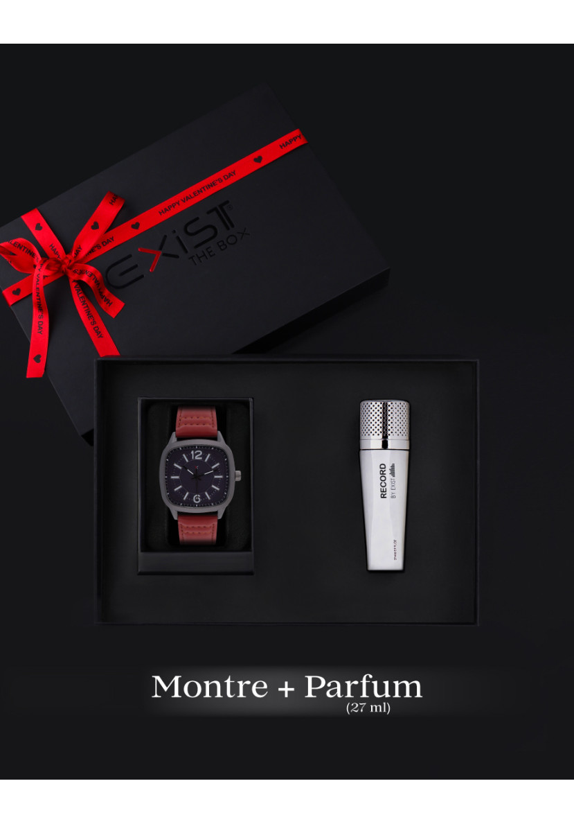 Ce coffret associe le parfum RECORD 27 ml, aux notes orientales boisées et raffinées, avec une montre au boîtier carré arrondi et cadran bleu et dont la ceinture est de couleur camel artisanale. Un trio harmonieux qui allie élégance intemporelle, modernité et savoir-faire.