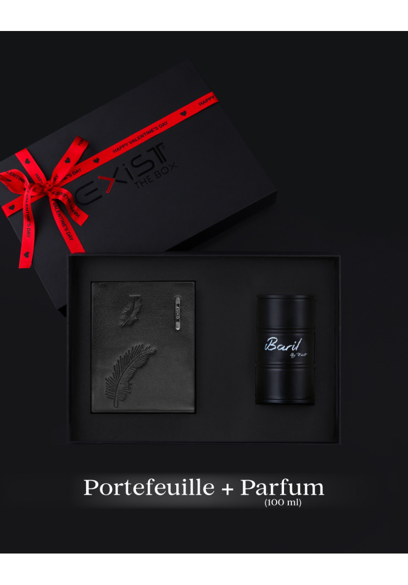 Ce coffret réunit le parfum BARIL by EXIST en format 100 ml, à la fragrance intense et affirmée, ainsi qu’un portefeuille noir raffiné, orné d’une plume incrustée ton sur ton et du logo EXIST en écusson. Un duo sophistiqué qui allie caractère et élégance, idéal pour un cadeau distingué