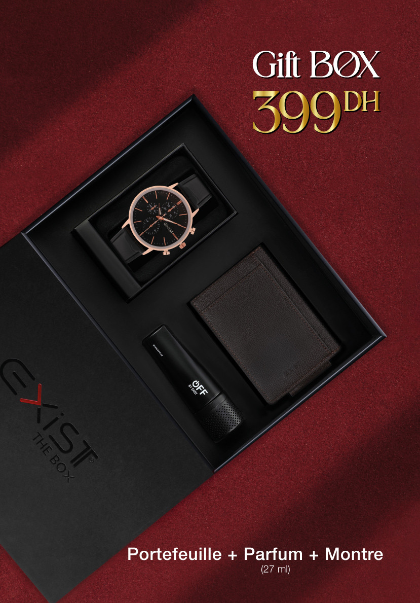 Ce pack cadeau homme réunit style et fonctionnalité : une montre élégante au cadran noir, un portefeuille raffiné au motif géométrique, et le parfum Off 27 ml, aux notes boisées et aromatiques, offrant une fragrance moderne et masculine. Présenté dans une Gift Box premium, c’est le coffret idéal pour un cadeau chic et sophistiqué.
